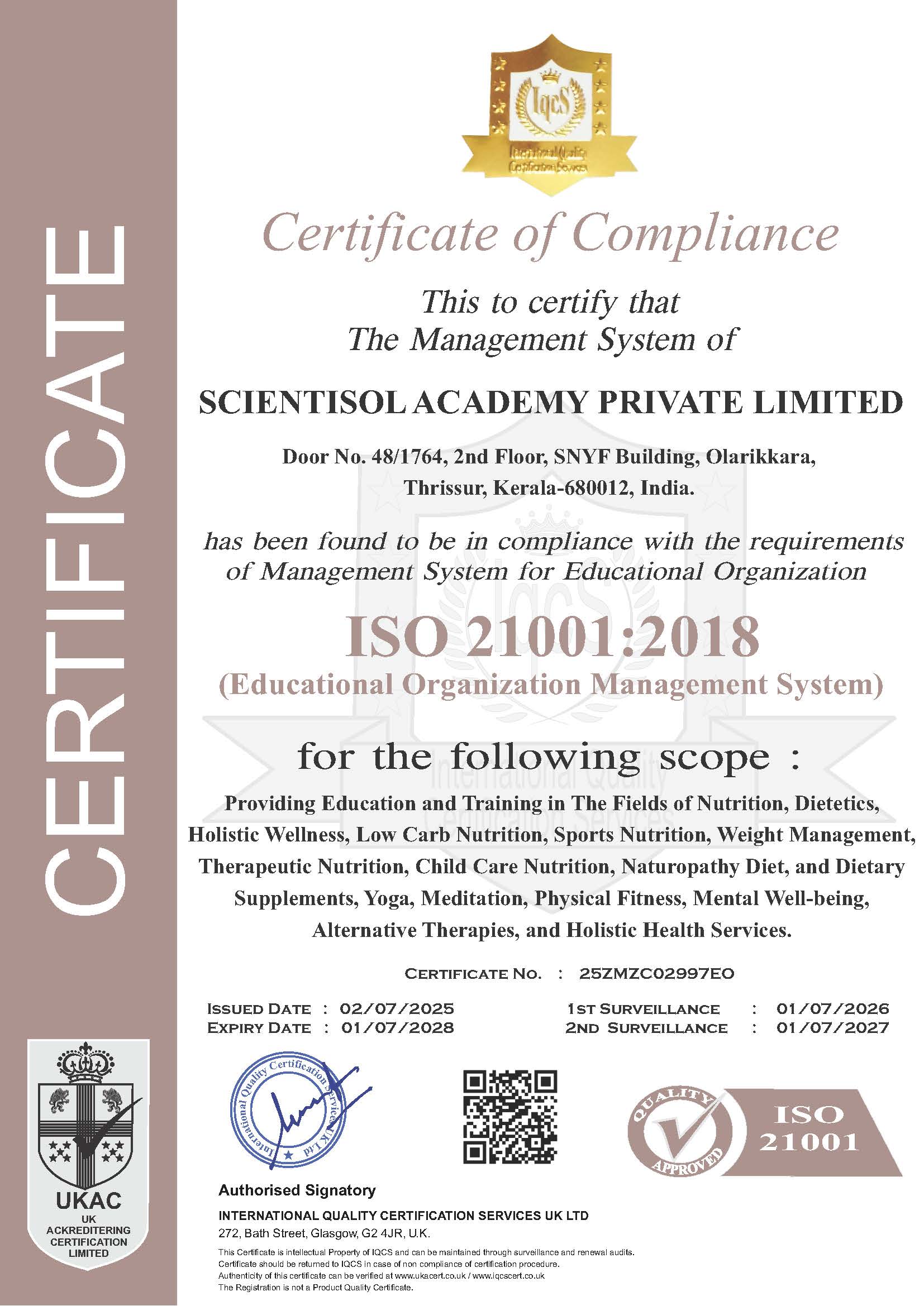 At the heart of our academy is our premier initiative — the Kerala Low Carb Academy — which serves as the official educational and certification wing of Scientisol Academy. This flagship brand is internationally accredited, ISO 9001:2015 and ISO 21001:2018 certified and affiliated with reputed universities, offering globally recognized diploma and postgraduate programs.